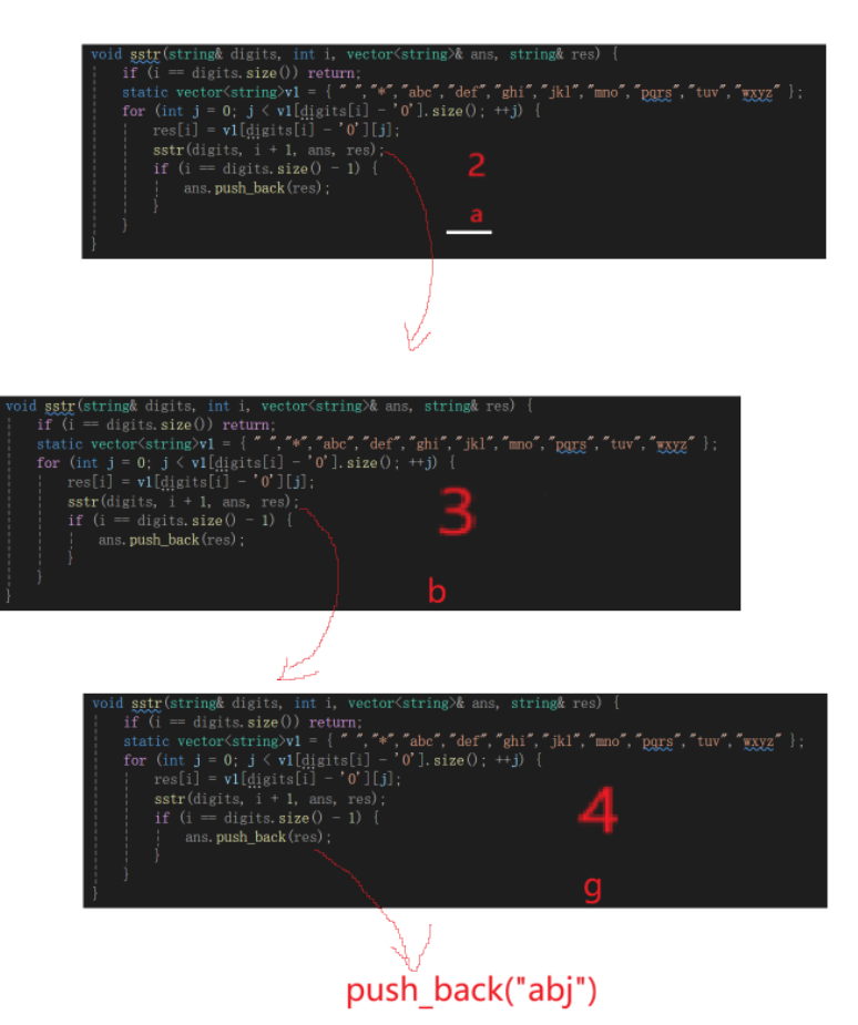 public:void sstr(string& digits, int i, vector<string>& ans, string& res) {//int i 记录的是当前的递归深度if (i == digits.size()) return;//递归结束条件static vector<string>v1 = { " ","*","abc","def","ghi","jkl","mno","pqrs","tuv","wxyz" };for (int j = 0; j < v1[digits[i] - '0'].size(); ++j) {//循环来遍历每个数字对应映射的所有字母。res[i] = v1[digits[i] - '0'][j];sstr(digits, i + 1, ans, res);if (i == digits.size() - 1) {//每次递归到最底层,将res存到vector里ans.push_back(res);}}}vector<string> letterCombinations(string digits) {vector<string> ans;string res(digits.size(), 'x');