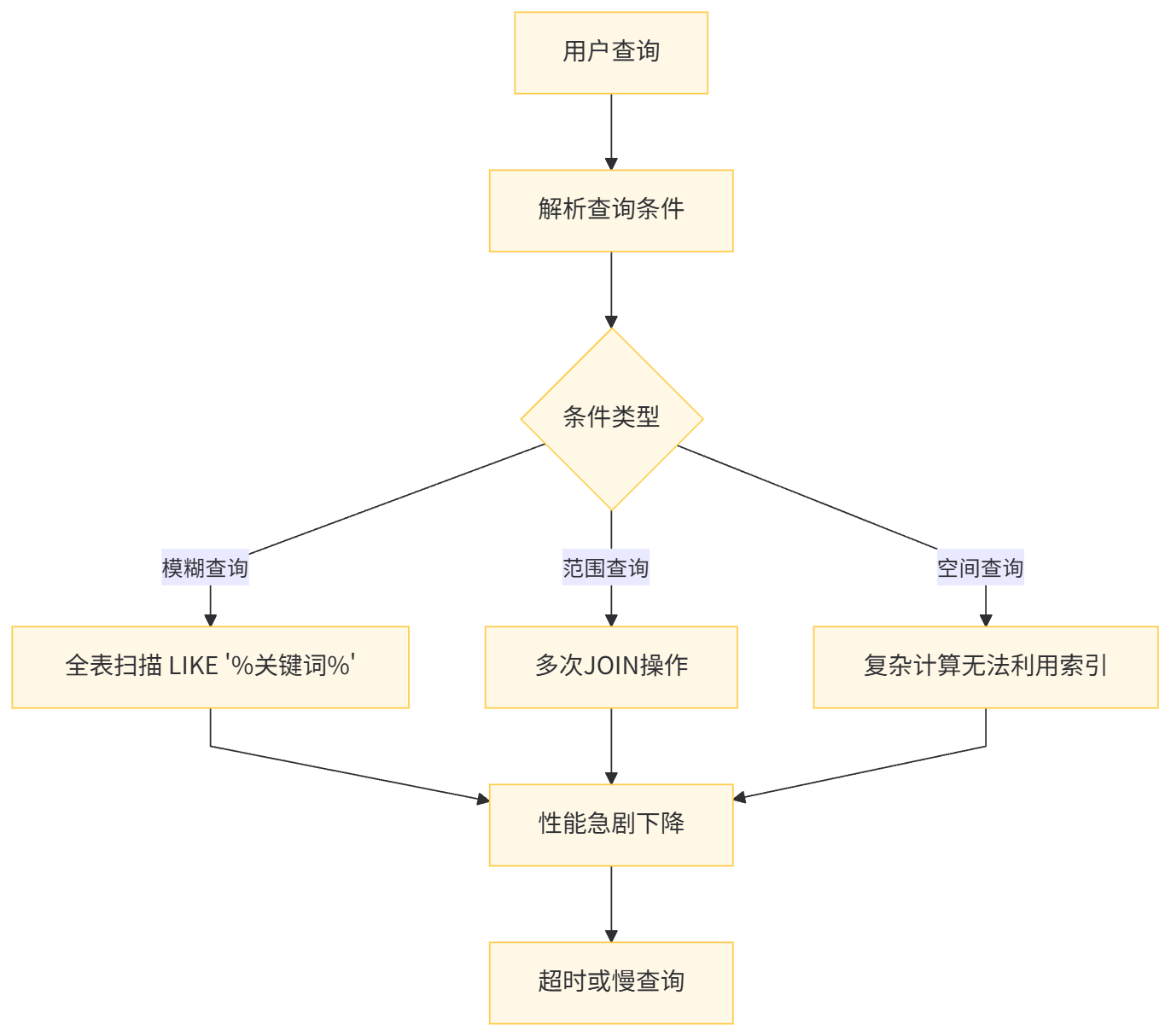 LIKE '%关键词%'会导致全表扫描,无法利用索引 - 多条件组合查询复杂:地址的多维度查询需要大量 JOIN 操作,性能随数据量增长急剧下降