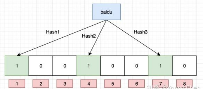 那么如果,我想查“chenyehao”这个词在不在,返回的是1.3.7的时候,一定存在吗,对比上图插入过程,显然不一定,因为随着增加的值越来越多,被置为 1 的 bit 位也会越来越多,这样某个值 “chenyehao” 即使没有被存储过,但是万一哈希函数返回的三个 bit 位都被其他值置位了 1 ,那么程序还是会判断这个值存在。