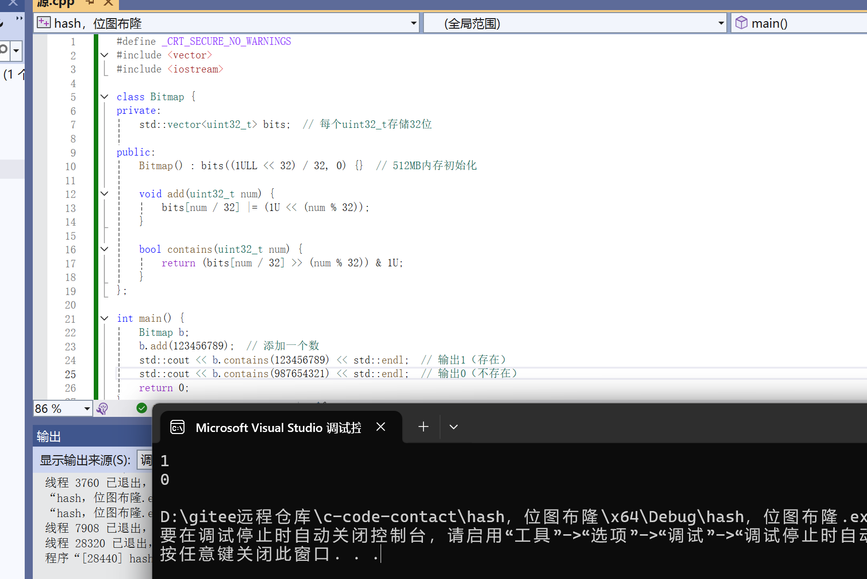 };int main() {Bitmap b;b.add(123456789); // 添加一个数std::cout << b.contains(123456789) << std::endl; // 输出1(存在)std::cout << b.contains(987654321) << std::endl; // 输出0(不存在)return 0;
