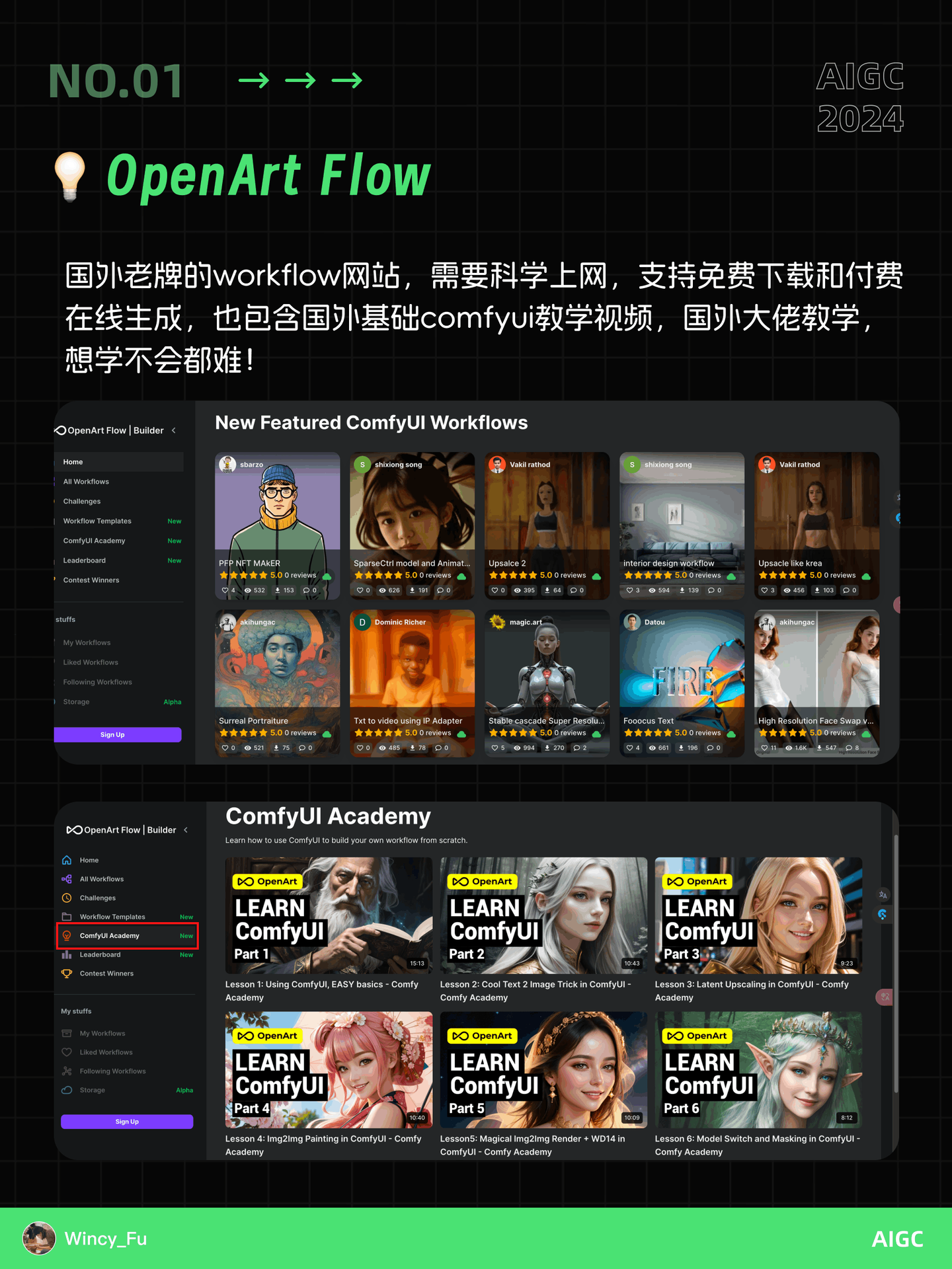 - OpenArt Flow:国外老牌的workflow网站,需要科学上网,支持免费下载和付费在线生成,也包含国外基础comfyui教学视频,国外大佬教学,想学不会都难!