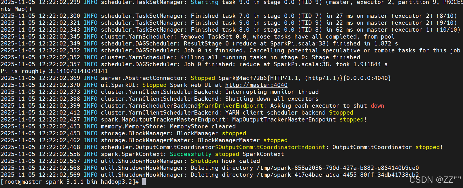 spark-submit --class org.apache.spark.examples.SparkPi --master yarn ./examples/jars/spark-examples_2.12-3.1.1.jar 10安装成功