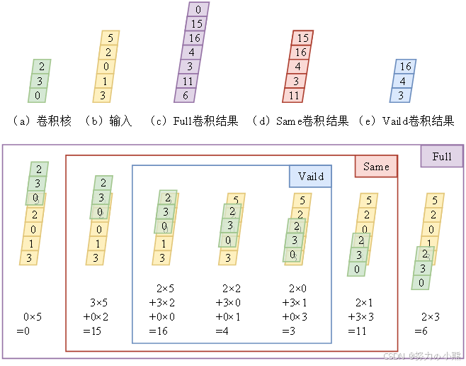 以一个长度为5的输入向量和大小为3的卷积核为例,下面演示三种卷积方式的卷积过程与结果。