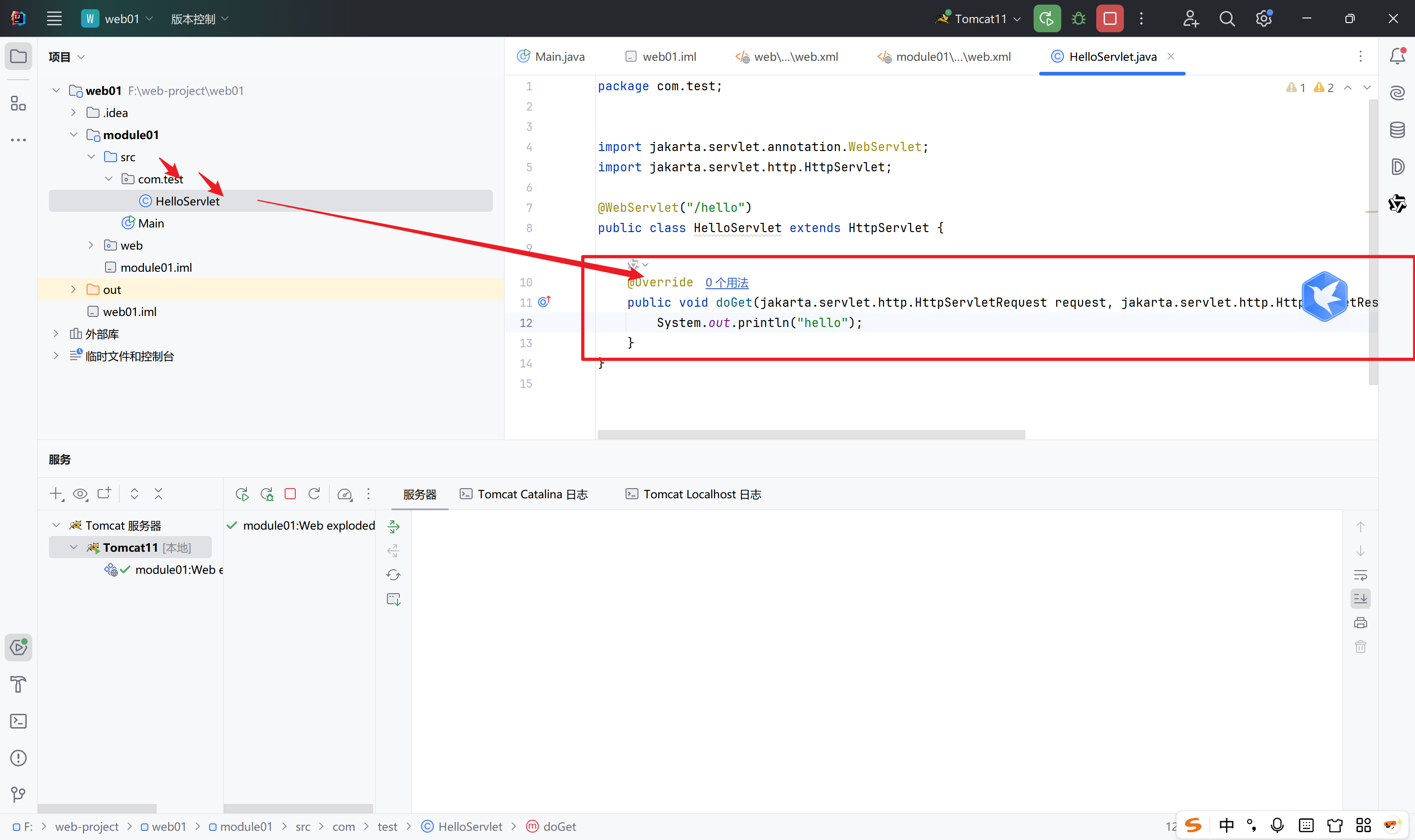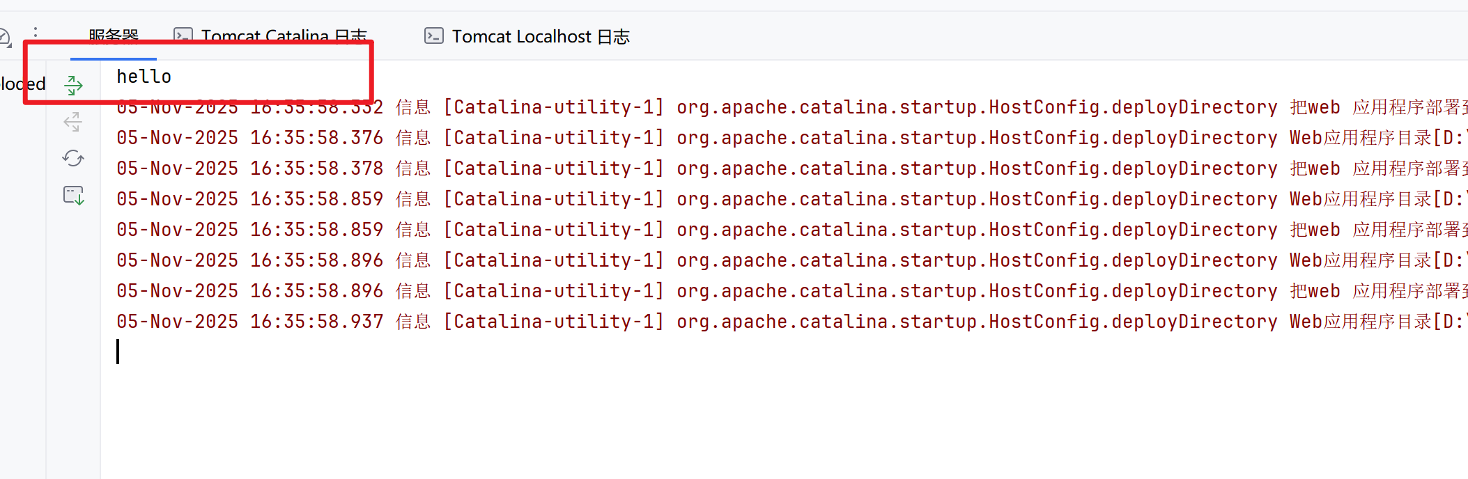 在浏览器中访问http://localhost:8081/hello,调用doget方法则成功,如下输出了hello