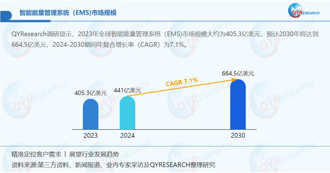 EMS市场正迎来爆发式增长。根据QYResearch的统计及预测,2024年全球EMS系统市场销售额达到了441亿美元,预计2031年将达到706.7亿美元,年复合增长率(CAGR)为7.1%(2025-2031)。随着能源转型的加速,EMS系统的应用场景将进一步扩大,为能源管理提供更创新解决方案。