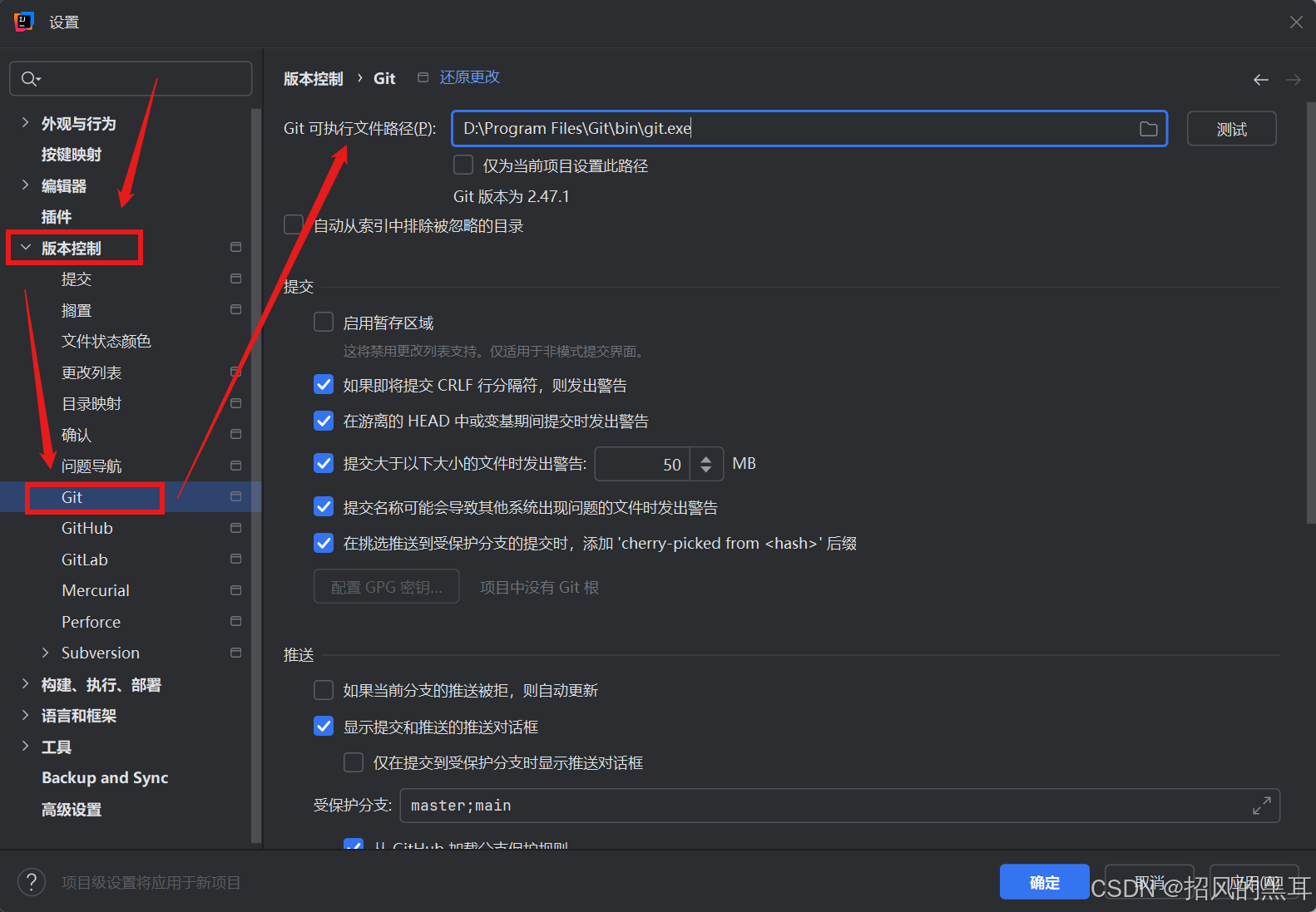 在设置中 → 版本控制 → Git → 可执行文件路径选择Git安装目录bin下的git.exe文件