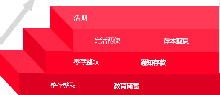 | 通知存款 (50000元) 不约定存期,支取时提前通知银行, 支取次数不限,约定支取日期和金额.通过 柜台或电话或网银渠道办理. 一天通知,七天通知.最低起存金额,最低支取金额和最低留存金额为50000元 | 通知存款的特点: 1.实际存期不足通知期限的,按活期利率; 2.未提前通知而支取的,支取部分按活期计息; 3.已办理通知手续但未按约定日期支取的,提前或逾期支取,支取部分按活期计息; 4.支取金额不足或超过约定金额的,差额部分按活期计息 |