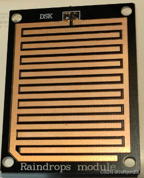 雨滴传感器有一个感应板,板上布满了一系列裸露的铜导线,这些导线通常放置在户外,可能安装在屋顶或者任何能直接受到雨水影响的地方。