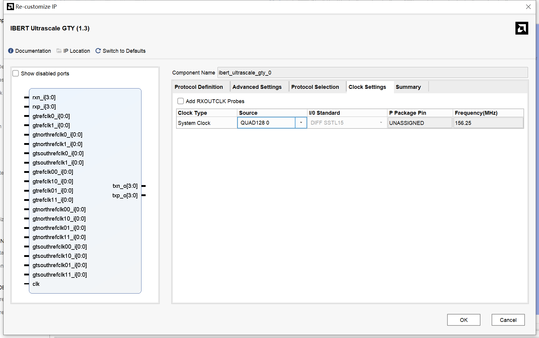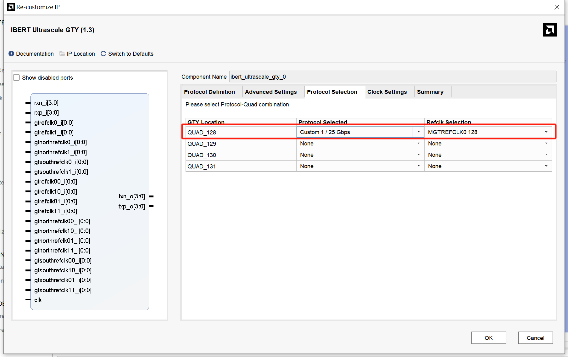 先测试MGT128上的光口,如下图所示配置选择QUAD_128,其时钟从原理图中可看到使用的是MGTREFCLK0。