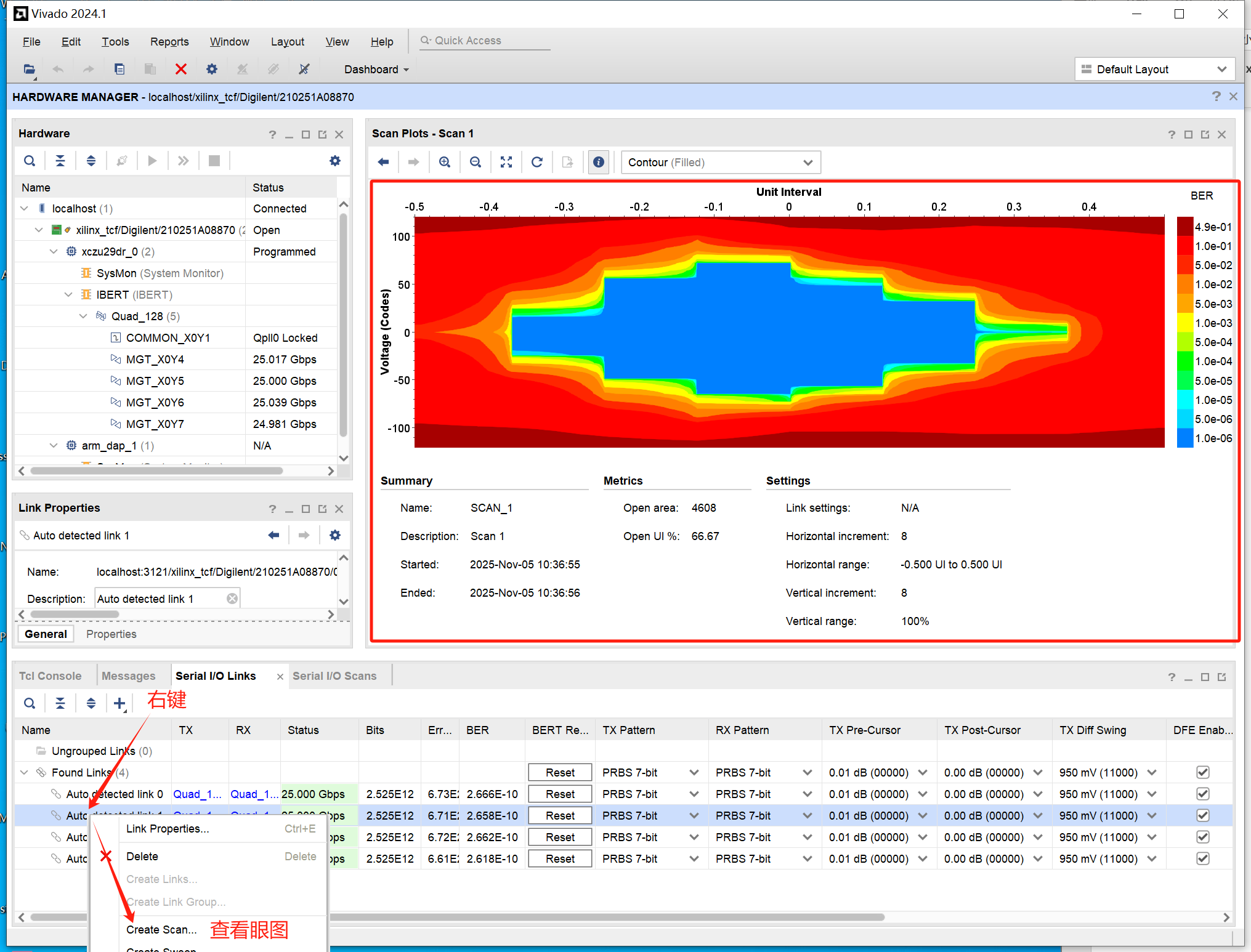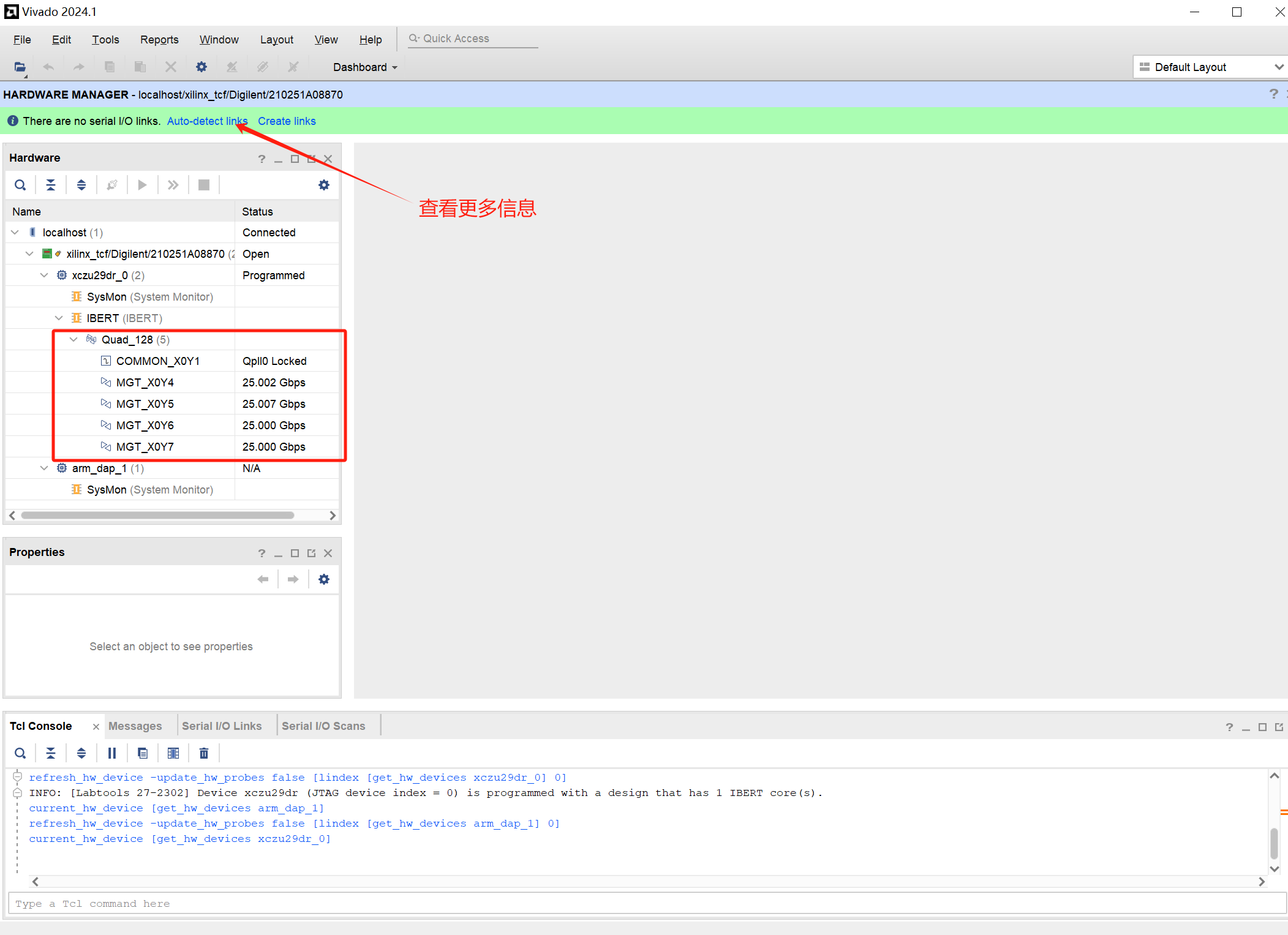 将生成的BIT文件烧写进板卡,如下图所示,可以看到每根线都有25G左右的速率,点击Auto-detect links,可看到更多的信息