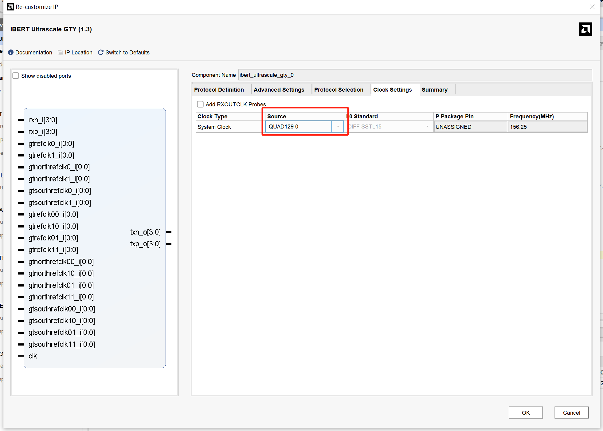 若测试MGT129在配置IP核时将协议绑定到QUAD_129上,时钟在原理图中可以看到129的时钟绑定在MGTREFCLK0 129上。