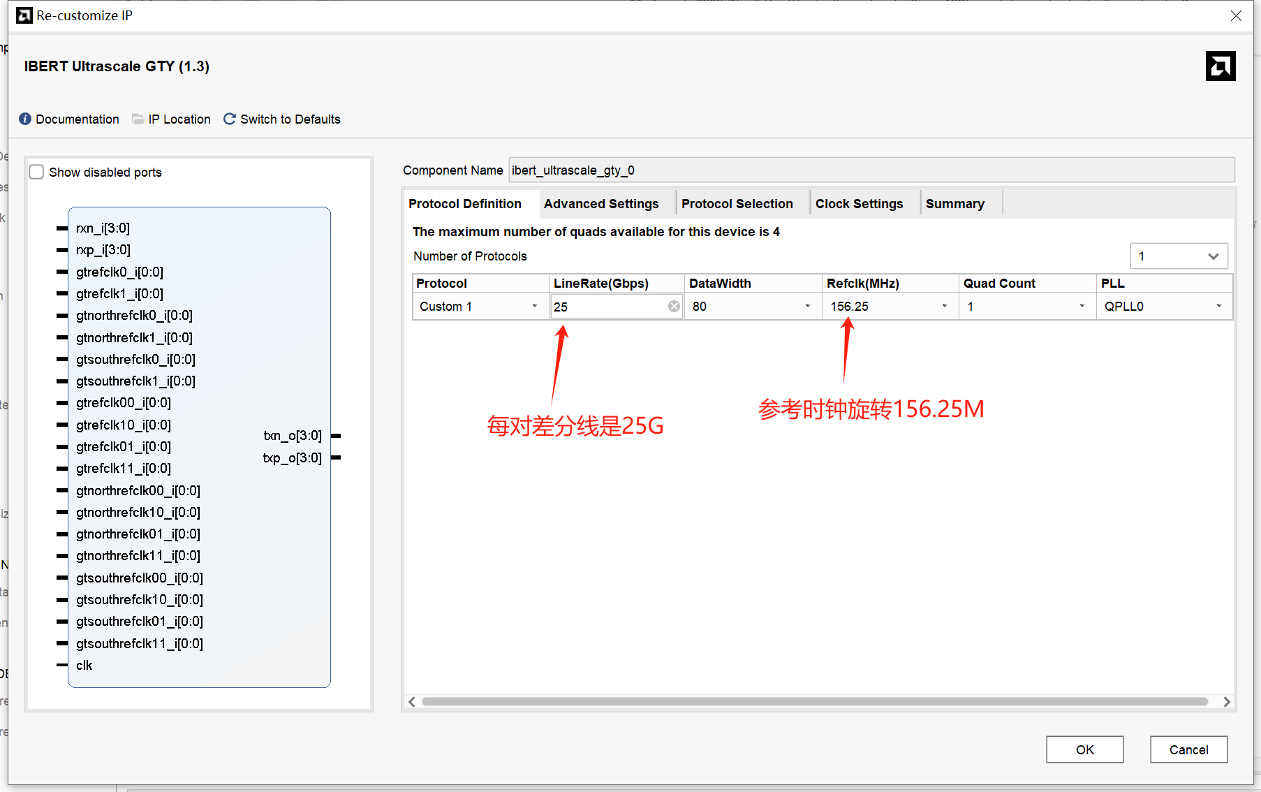 在VIVADO中添加IP核iberf模块,修改配置。一个100G光口有四根差分线,每对差分线的速度为25G。从上面原理中可以看到光口使用的参考时钟为156.25M。