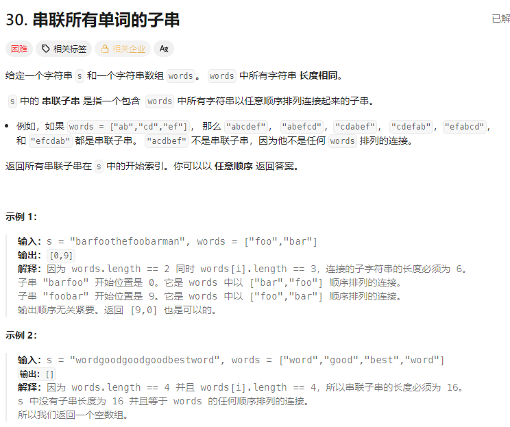 public:vector<int> findSubstring(string s, vector<string>& words) {unordered_map<string,int> mp;for(auto& e : words){mp[e]++;}int len = words[0].size();int size = words.size();vector<int> ret;for(int i = 0; i < len;i++){int left = i;int count = 0;unordered_map<string,int> mp1;for(int right = i; right < s.size();right += len){string str;str = s.substr(right,len);mp1[str]++;if(mp1[str] && mp1[str] <= mp[str]) count++;while(right - left + 1 > size*len){string tmp;tmp = s.substr(left,len);if(mp1[tmp] <= mp[tmp]) count--;mp1[tmp]--;left += len;}if(count == size) ret.push_back(left);}}return ret;}