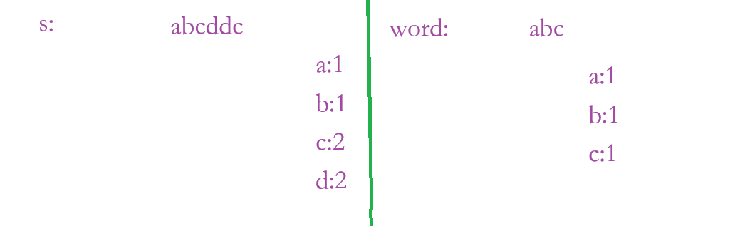我们可以看上面这个例子,我们记录s数组每个字母的个数,假设s数组在一段区间内的a、b、c的个数都为1,而和我们目标数组word的每个字母的个数相同,那么无论s数组的这段区间的a、b、c字母怎么排列都是我们目标的数组。