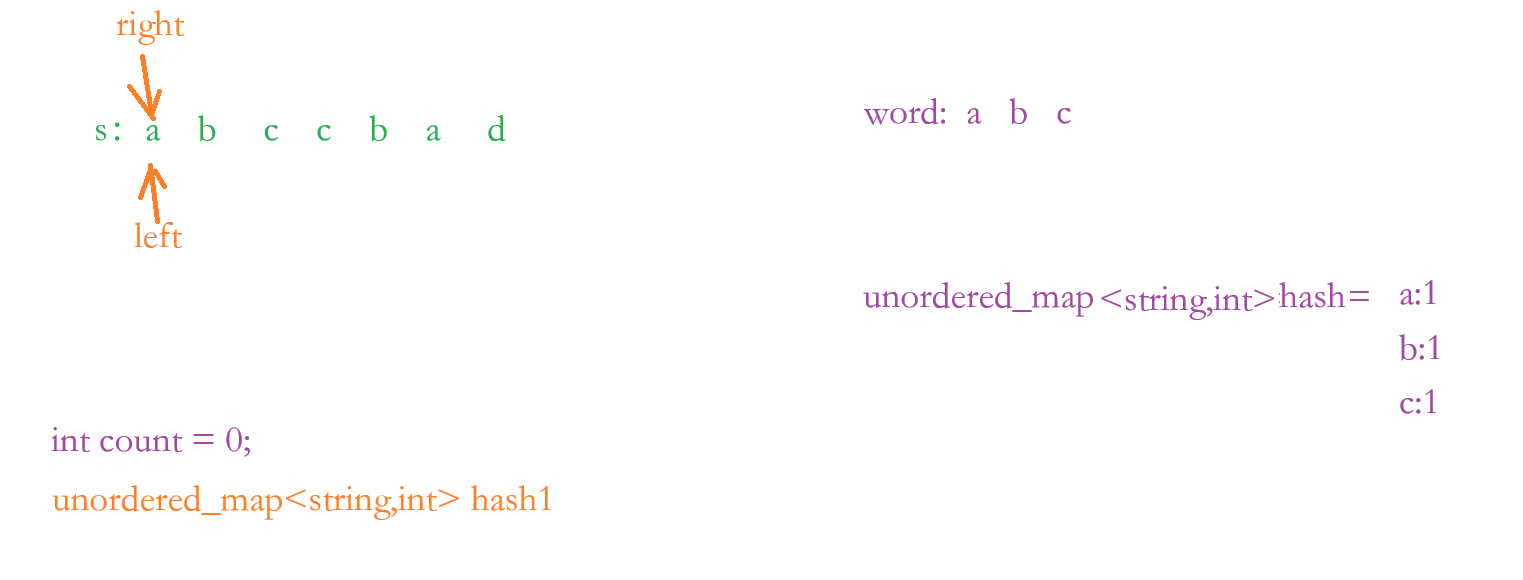 我们可以定义两个哈希表来记录每个单词的个数,又定义一个 count 来记录s组织的有效字母,有效字母就是:if:hash1[ a ] <= hash[ a ] ,他是属于 word 字母中的其中一个,此时就是有效字母;我们记录的word字符串,所以当 right 遍历的字母大于word的长度时,我们就要移动 left 的指向的字母了,使他变得合法,同时也要把left指向的字母从hash1中移除。此时right往后遍历就行,不用返回到和 left 指向的字母一样的下标,因为left到right之间的字母都没有符合word,所以就算right回到跟left指向的字母的下标一样,然后重新遍历,当遍历到和上次的right指向的字母的下标时,此时也是不符合word字符串的,所以当left要更新时,right 往后遍历就行。只要 count 等于word的字母个数,此时就是我们要的答案。