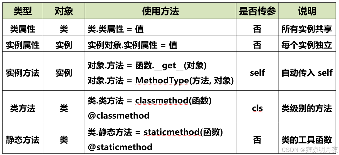4.方法(Method):类中定义的函数,分为 “实例方法”(操作实例属性,如 deposit)、“类方法”(操作类属性,用 @classmethod,且第一个参数名为cls)、“静态方法”(无默认参数,用 @staticmethod)。