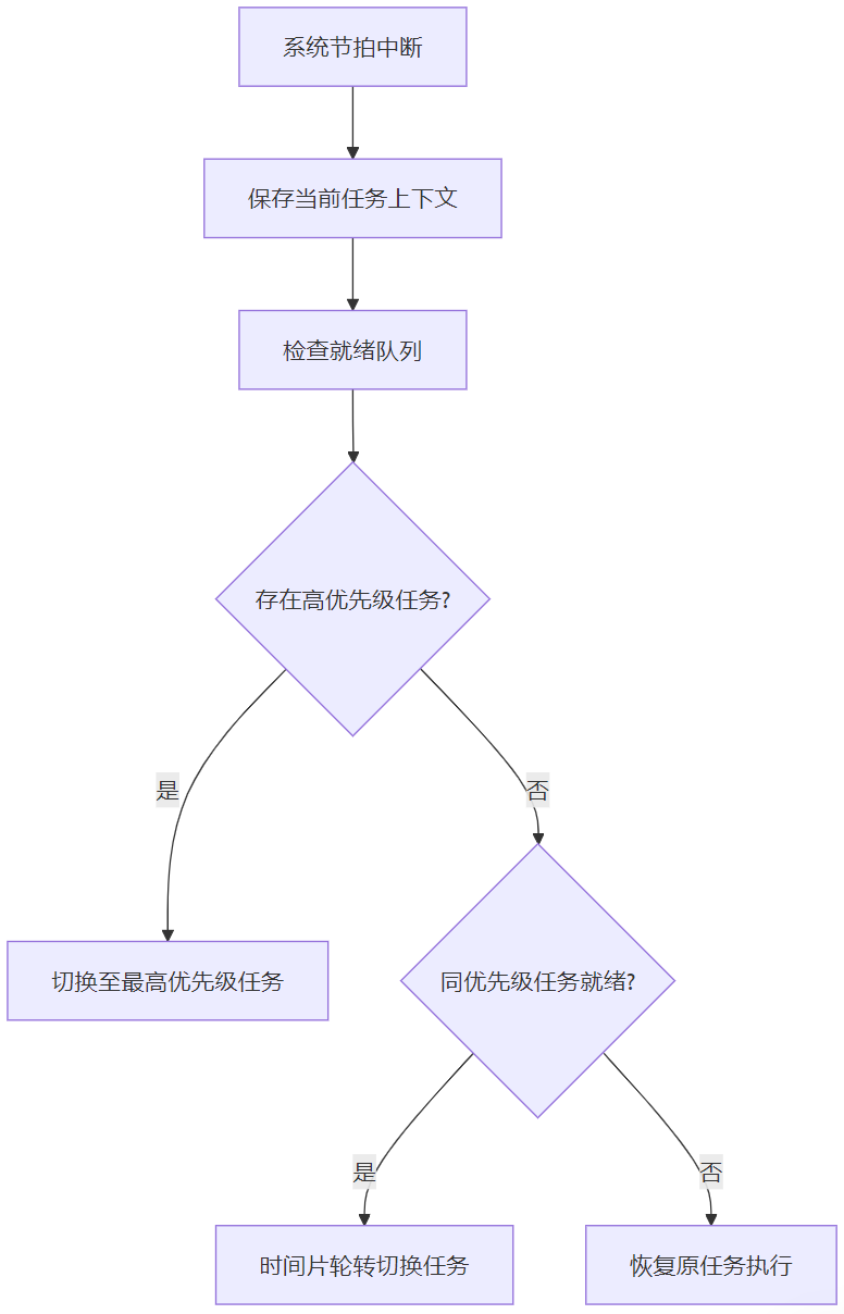 taskSpawn("tDataAcq", 3, 0, 4096, (FUNCPTR)data_acq_task, 0, 0, 0, 0, 0, 0, 0, 0, 0, 0);/* 任务优先级设置:5级为最高,1级为最低 */2.2 优先级调度:抢占式与时间片的混合策略