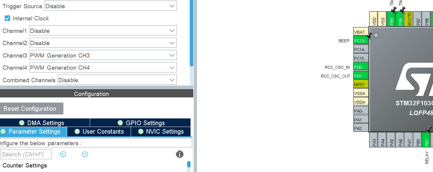 __HAL_TIM_SET_COMPARE(&htim4, TIM_CHANNEL_3,100); __HAL_TIM_SET_COMPARE(&htim4, TIM_CHANNEL_4,100);HAL_TIM_PWM_Start(&htim4,TIM_CHANNEL_3);HAL_TIM_PWM_Start(&htim4,TIM_CHANNEL_4);在外部中断回调函数中,实现按键按下对PWM波占空比的调节。