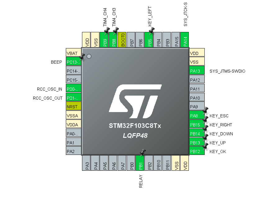 {if(GPIO_Pin == KEY_UP_Pin){//LED_Control(LED1,ON);__HAL_TIM_SET_COMPARE(&htim4, TIM_CHANNEL_3,0); __HAL_TIM_SET_COMPARE(&htim4, TIM_CHANNEL_4,0);}else if(GPIO_Pin == KEY_DOWN_Pin){//LED_Control(LED1,OFF);__HAL_TIM_SET_COMPARE(&htim4, TIM_CHANNEL_3,20); __HAL_TIM_SET_COMPARE(&htim4, TIM_CHANNEL_4,20);}else if(GPIO_Pin == KEY_LEFT_Pin){//LED_Control(LED2,ON);__HAL_TIM_SET_COMPARE(&htim4, TIM_CHANNEL_3,40); __HAL_TIM_SET_COMPARE(&htim4, TIM_CHANNEL_4,40);}else if(GPIO_Pin == KEY_RIGHT_Pin){//LED_Control(LED2,OFF);__HAL_TIM_SET_COMPARE(&htim4, TIM_CHANNEL_3,60); __HAL_TIM_SET_COMPARE(&htim4, TIM_CHANNEL_4,60);}else if(GPIO_Pin == KEY_OK_Pin){//BEEP_Control(ON);__HAL_TIM_SET_COMPARE(&htim4, TIM_CHANNEL_3,80); __HAL_TIM_SET_COMPARE(&htim4, TIM_CHANNEL_4,80);}else if(GPIO_Pin == KEY_ESC_Pin){//BEEP_Control(OFF);__HAL_TIM_SET_COMPARE(&htim4, TIM_CHANNEL_3,100); __HAL_TIM_SET_COMPARE(&htim4, TIM_CHANNEL_4,100);}
