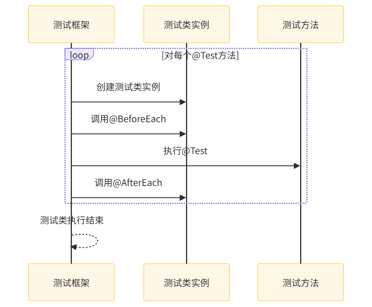 要理解这两个注解的工作原理,必须先掌握 JUnit 5 中测试实例的生命周期。与 JUnit 4 不同,JUnit 5 默认采用 “per-method” 模式:每个测试方法都会创建一个新的测试类实例。