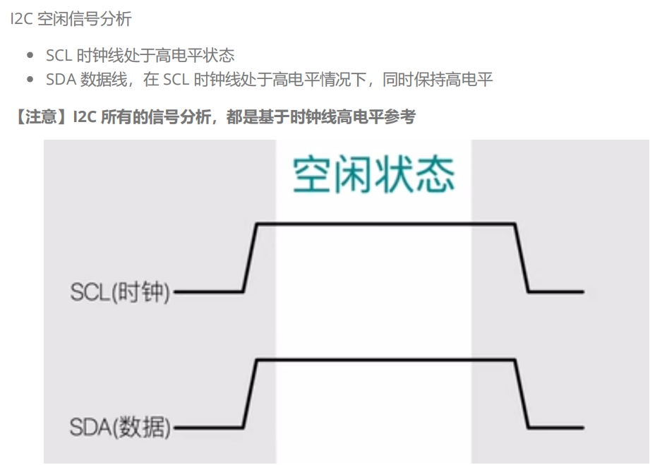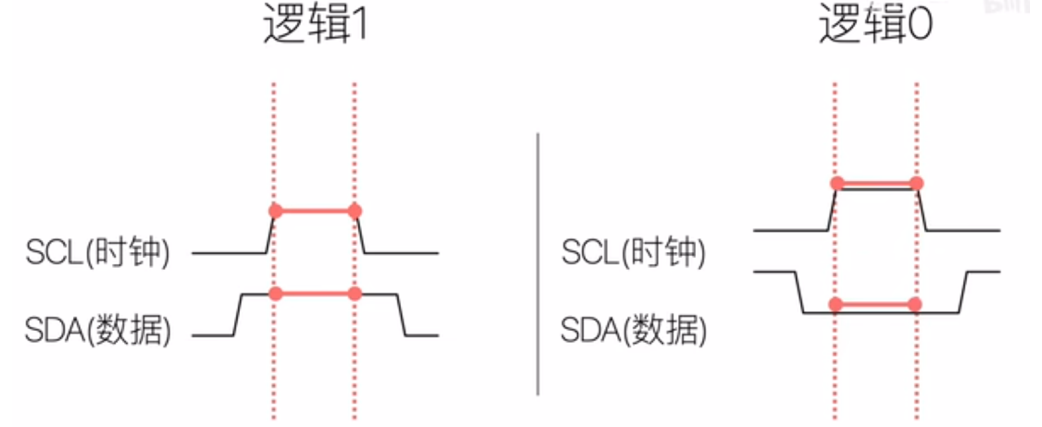 逻辑 1: SCL 时钟线处于高电平状态,SDA在整个 【SCL高电平周期内】,保持高电平状态,一般情况下,SDA 数据线拉高早于时钟线 SCL 时钟线,后续拉低晚于SCL时钟线。