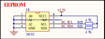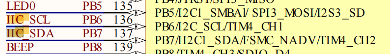 在 STM32中 IIC的SCL时钟线对应的引脚为PB6,SDA数据线对应的引脚是PB7,结合EEPROM原理图来看