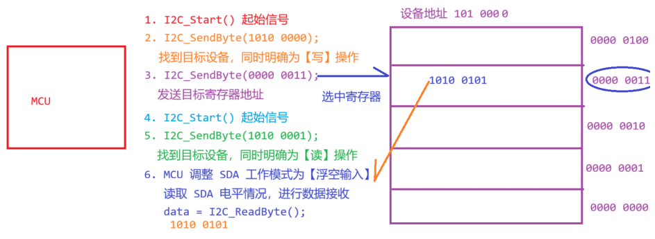 | 写地址阶段 | 起始位(S)→ 设备地址(7 位)+ 写位(0)→ 应答(ACK)→ 寄存器地址(8 位)→ 应答(ACK)→ 重复起始位(Sr) | 先向从机指定要读取的寄存器地址 |