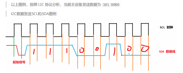 - 起始位【1位】,主机触发 I2C 数据总线工作,告知当前 I2C 对应 SDA 和 SCL 所有设备进入 就绪状态