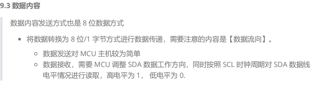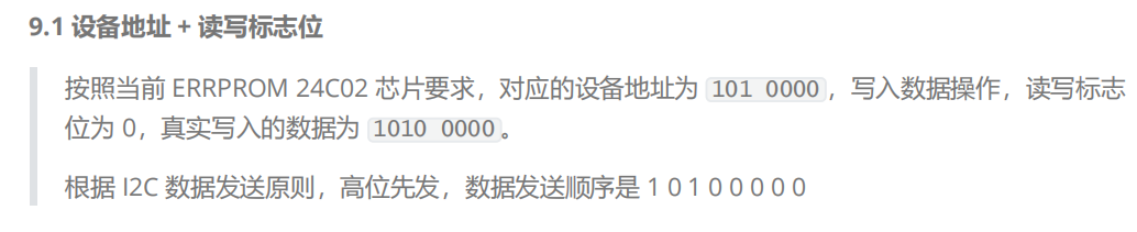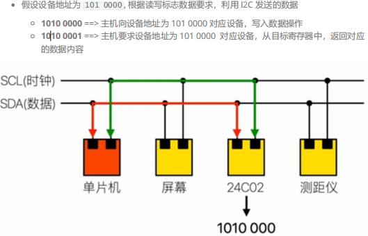 - 读/写标志位【1位】,明确当前 MCU 操作当前 I2C 设备是进行读操作还是写操作,需要当 前当前设备地址进行组合,一并作为一个字节数据发送给对应 I2C 设备。0 写入操作。1 位读 取操作