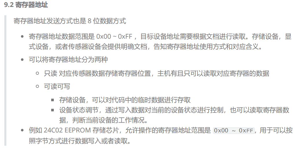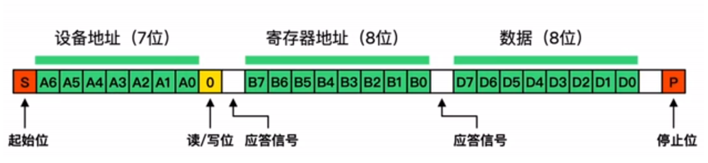 - 寄存器地址【8位】,按照当前图例分析,目标写入数据的 I2C 设备寄存器地址,当前寄存器 地址范围是 0x00 ~ 0xFF,仅考虑基本的字节操作,I2C 设备可以支持的最大存储器为 256 byte。可以根据后续编号进行拓展。