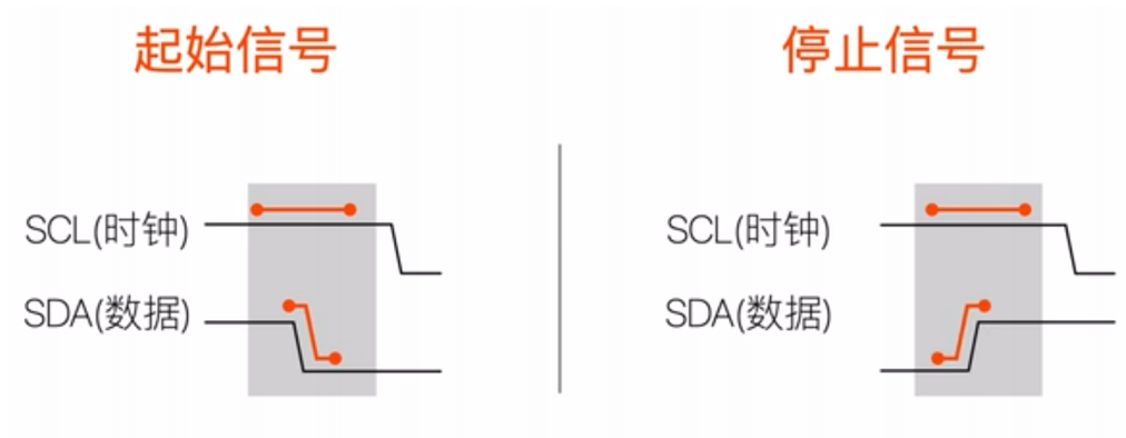 起始信号是 SCL 处于高电平状态,在 SCL 处于高电平期间,SDA 实现一次从高到低的跳变。