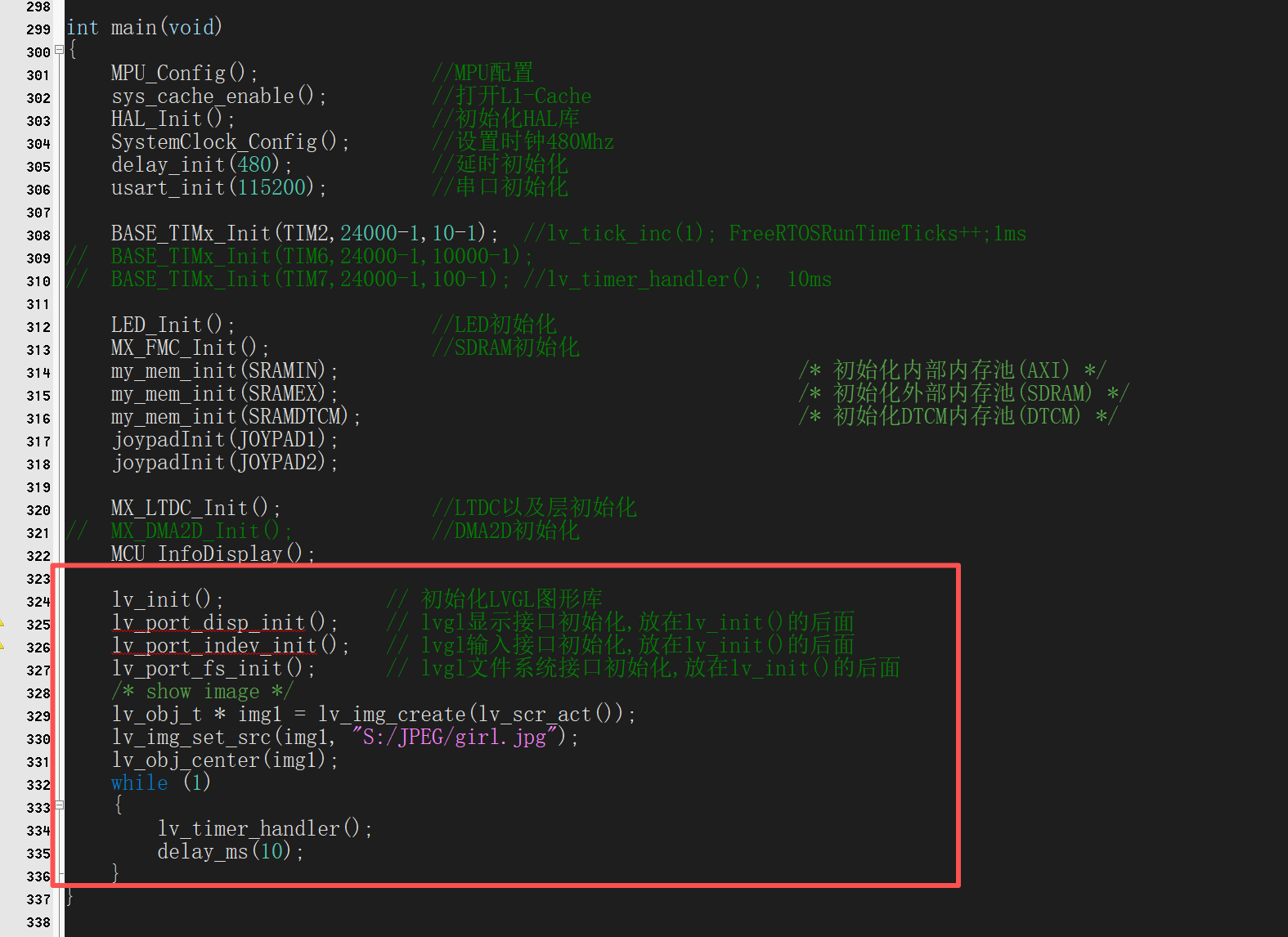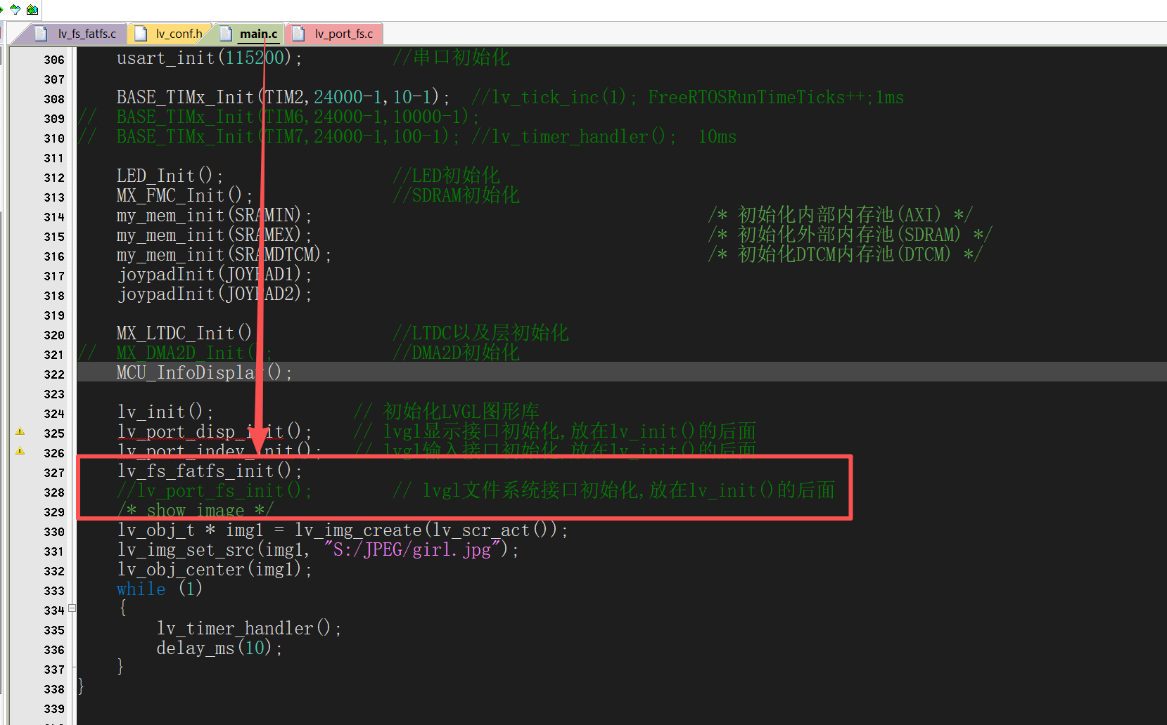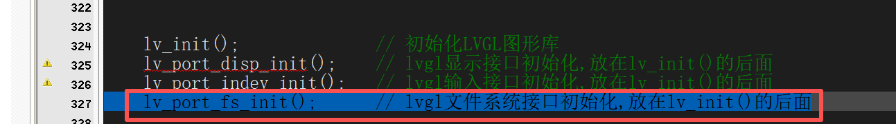 在main.c里面调用lv_port_fs_init(); 初始化FatFs文件系统:
