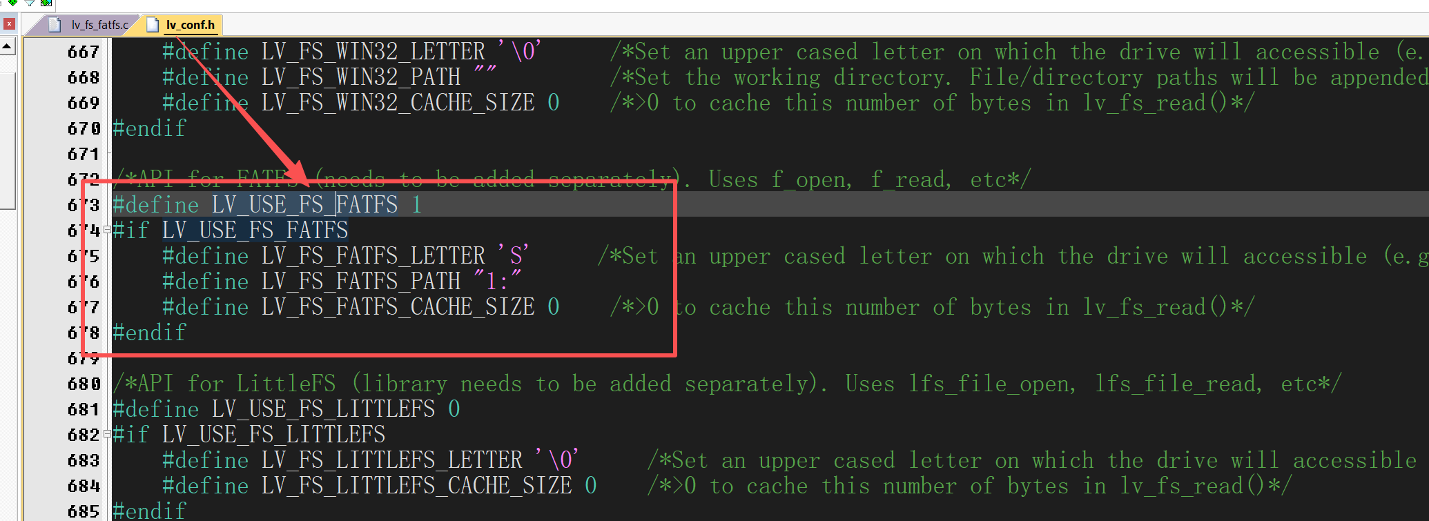 同理,开启LV_USE_FS_FATFS,然后设置好LV_FS_FATFS_LETTER,LV_FS_FATFS_PATH 如图: