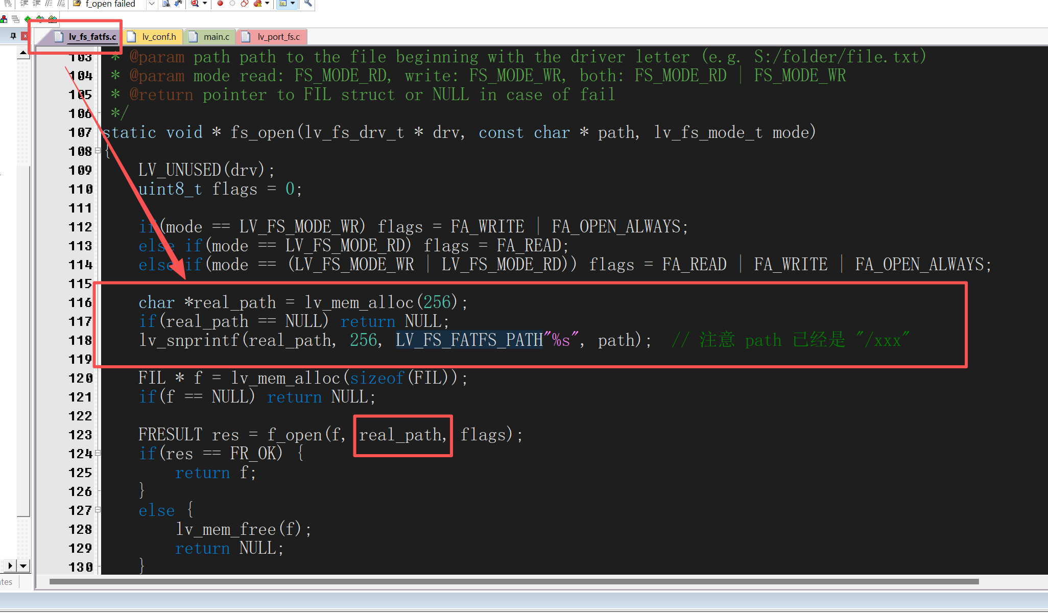 {lv_fs_res_t res = LV_FS_RES_NOT_IMP;BYTE fatfs_mode = 0;/*把LVGL的打开文件的模式和FatFs一一对应好*/if(mode == LV_FS_MODE_WR) fatfs_mode = FA_WRITE | FA_OPEN_ALWAYS;else if(mode == LV_FS_MODE_RD) fatfs_mode = FA_READ;else if(mode == (LV_FS_MODE_WR | LV_FS_MODE_RD)) fatfs_mode = FA_READ | FA_WRITE | FA_OPEN_ALWAYS;/* LVGL 传进来的path已经没有盘符,比如 "test.txt" ,我们需要把盘符补充上去,然后才能给f_open使用*/char *full_path = lv_mem_alloc(256);if(full_path == NULL) return NULL;lv_snprintf(full_path, 256, "1:%s", path); // 注意 path 已经是 "/xxx"//printf("fs_open full_path=%s \n",full_path);FIL * f = lv_mem_alloc(sizeof(FIL)); // 为每个文件分配空间if(f == NULL){printf("lv_mem_alloc failed ! (f == NULL)\r\n");return NULL;}FRESULT fr = f_open(f, full_path, fatfs_mode);if(fr == FR_OK) {printf("fs_open full_path=%s OK !\n",full_path);return f;}else {printf("f_open failed: %d, full_path=%s\n", fr, full_path);lv_mem_free(f);return NULL;}