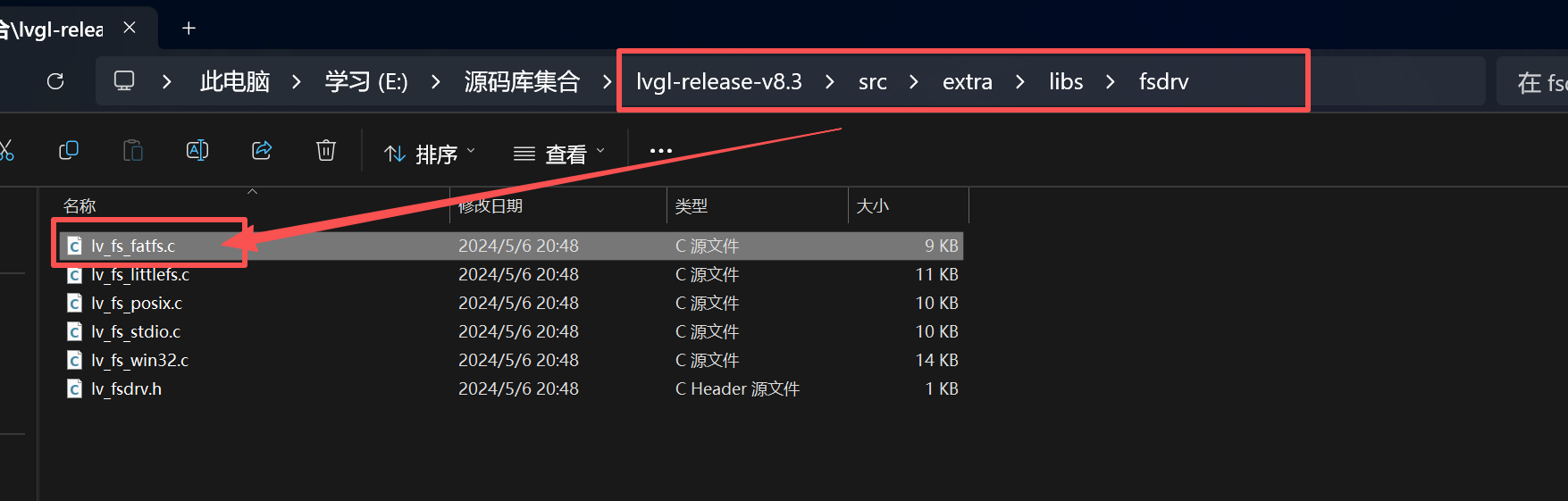 在源码包里面的\src\extra\libs\fsdrv\lv_fs_fatfs.c就是LVGL官方已经适配好的FatFs适配层。