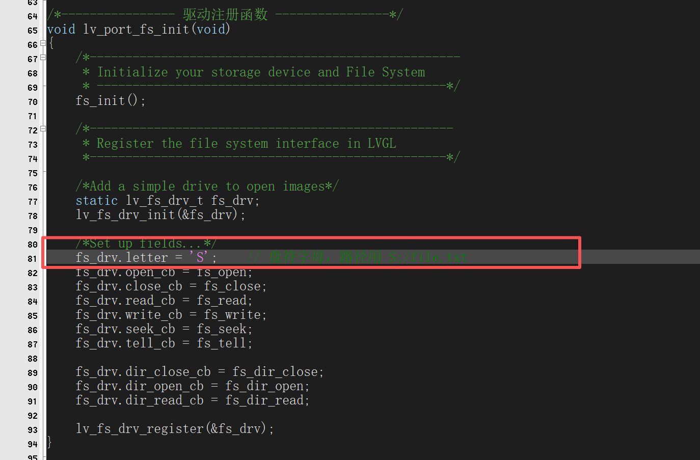 这个函数我们需要改动的其实很少,只需要设置一下fs_drv.letter: