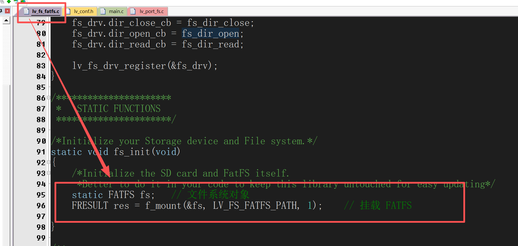 然后打开LVGL源码自带的lv_fs_fatfs.c,找到fs_init,添加一下挂载文件系统的代码: