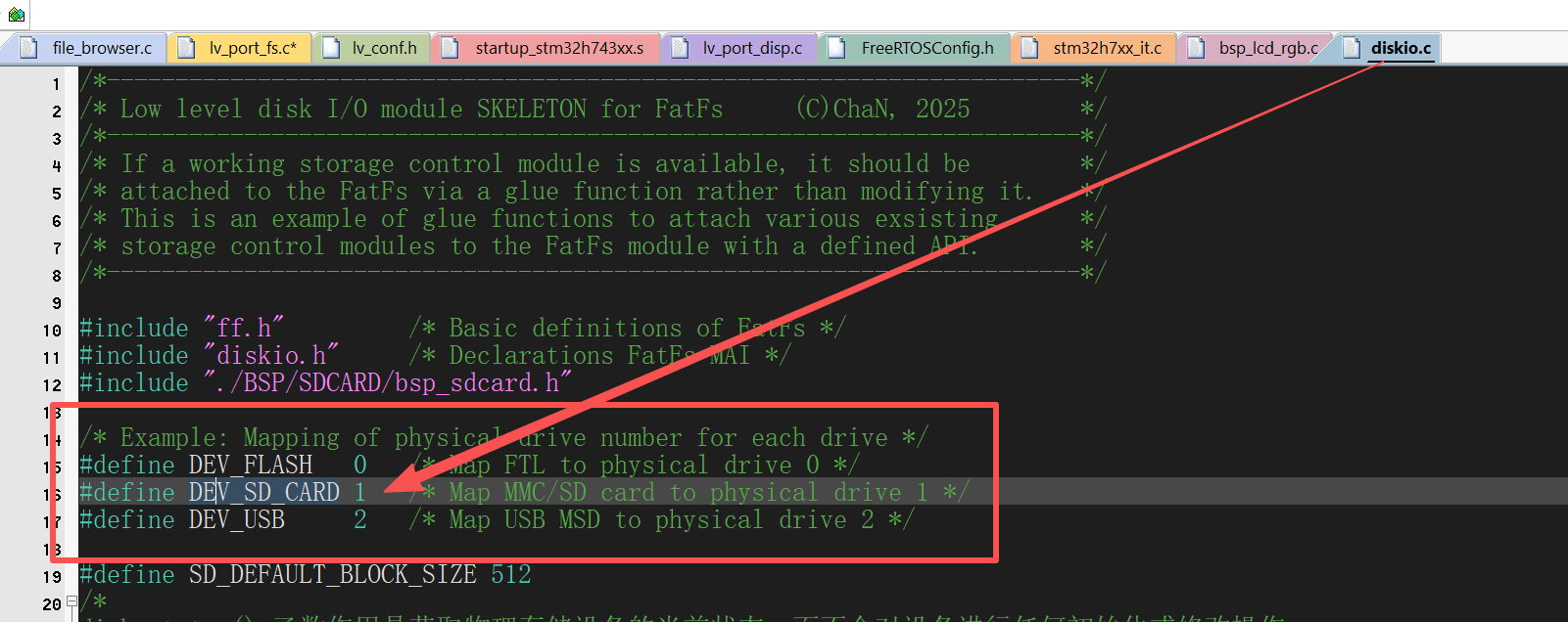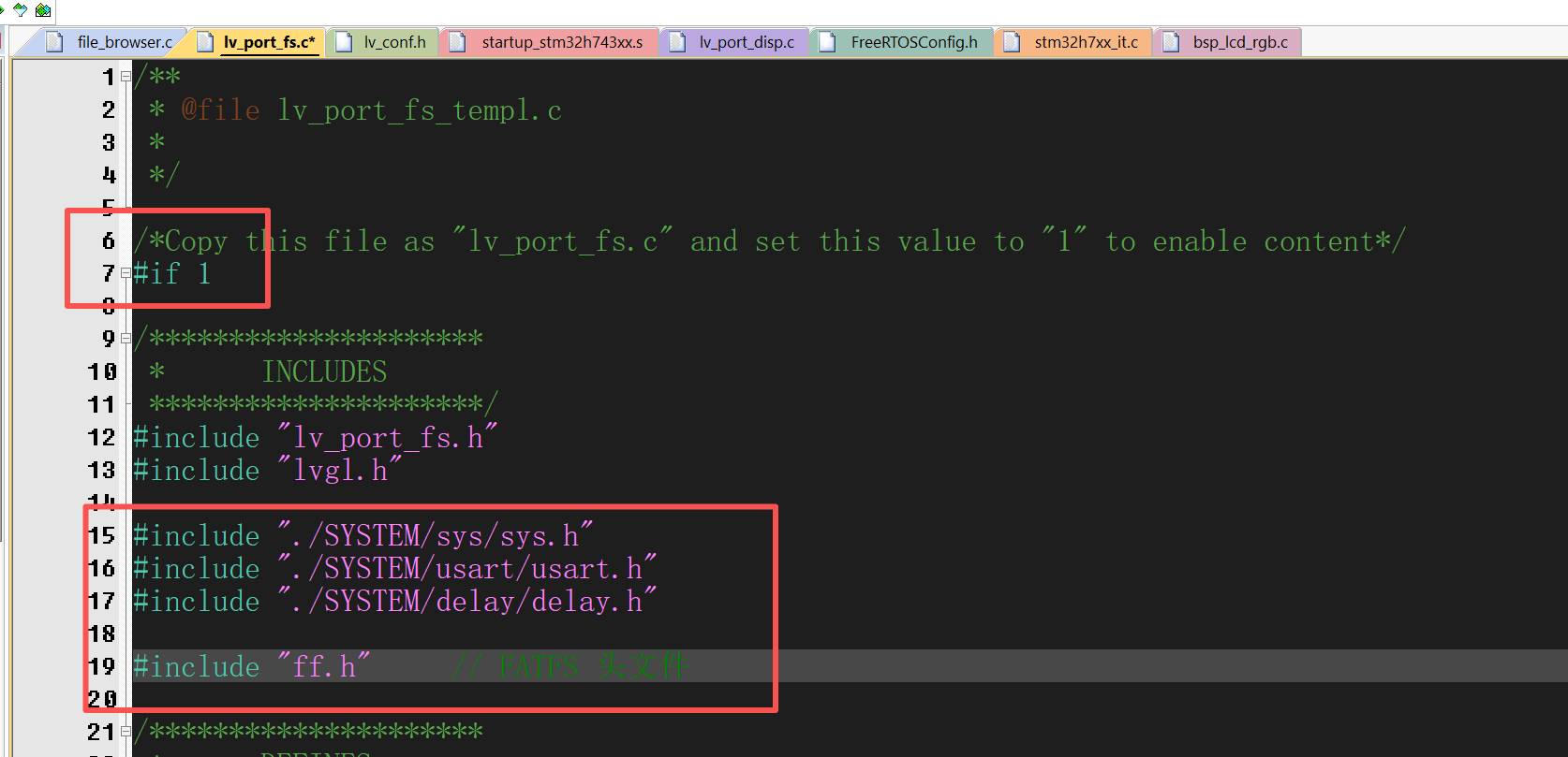 在使用#if 1启用lv_port_fs.c后,我们还需要添加好FatFs文件系统头文件和MCU一下你用到的头文件: