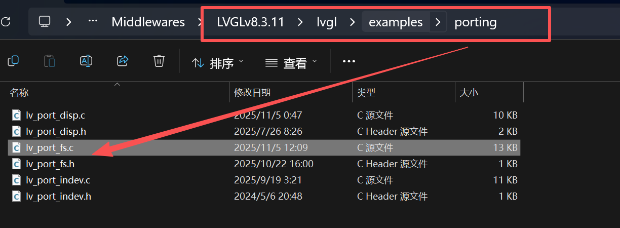 所谓的LVGL 文件系统抽象层API移植,简单来讲就是把FatFs的文件系统操作API和LVGL 文件系统抽象层API对接在一起,实现LVGL可以通过自己的文件系统API来操作SD卡里面的内容。和之前LVGL移植适配屏幕驱动一样,LVGL文件系统一样是有一个lv_port_fs.c这样的文件系统适配层文件,接下来我们就是要对这个文件做移植适配。