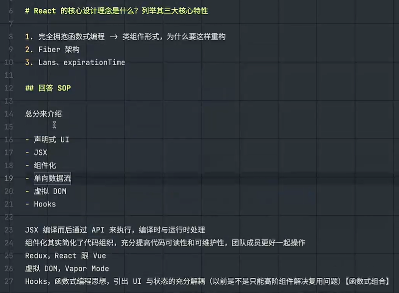 综上,React 以 “组件化 + 声明式 + 函数式” 为核心设计理念,通过组件化组织、声明式 UI+JSX、虚拟 DOM+Fiber三大核心特性,解决了复杂 Web 应用的 UI 开发、性能与维护难题,成为现代前端生态的核心框架之一。