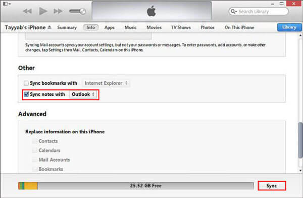 接下来是一个苹果用户可能熟悉的程序。没错,就是iTunes。现在,你可能会说你已经尝试过,而且你很确定iTunes不能用来传输笔记。确实,在某种程度上这是有道理的,因为你需要在传输笔记之前安装Outlook。因此,如果你不习惯使用Outlook,或者不想下载和安装它,建议你选择方案1,作为一种无需使用iTunes即可将iPhone上的笔记传输到电脑的替代方案。使用iTunes将iPhone上的笔记与Outlook同步的步骤: