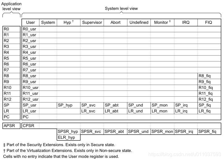 arm处理器内部的寄存器数量相比x86架构的处理器要多一些,某些cpu模式还拥有专用的寄存器,arm处理器寄存器和处理器模式的对应关系如下图所示。所有模式共用PC和CPSR;除了FIQ模式,所有模式共用R0-R12寄存器,专用的寄存器有SP、LR及SPSR;FIQ模式下有专用的R8-R12寄存器。