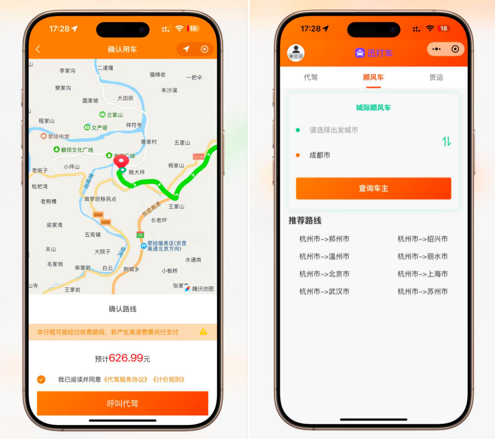 服务聚合:整合打车、代驾、顺风车、货运、租车等主流出行场景