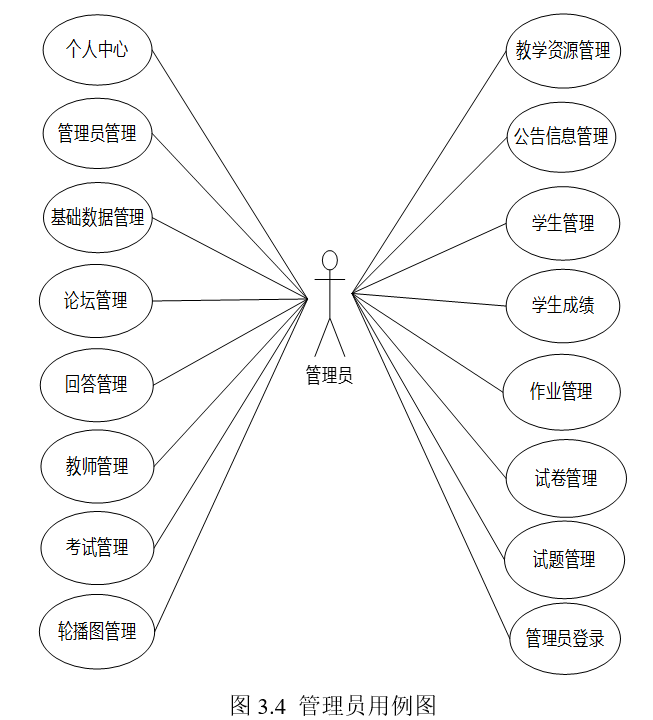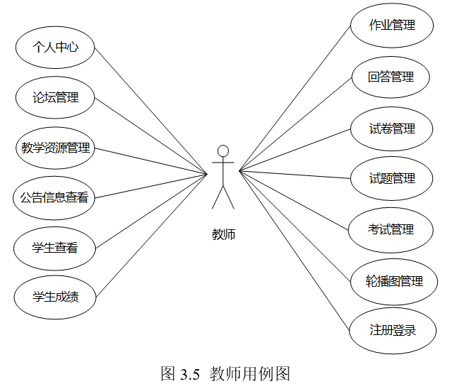 教师对于在线开放课程操作的功能包括增删改查试卷,试题,作业,学生成绩信息,查看学生信息,管理考试信息等。其用例图如图3.5所示: