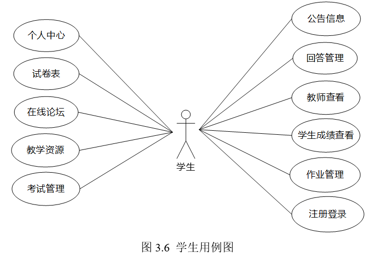 学生对于在线开放课程操作的功能包括观看教学资源视频,下载教学资源文件,选择试卷进行考试,完成布置的作业,查看学科成绩以及考试试卷的分数等。其用例图如图3.6所示: