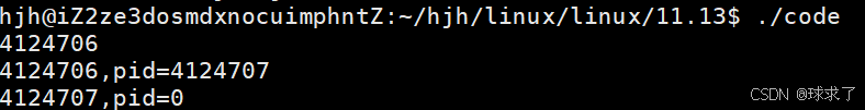 {printf("%d\n",getpid());pid_t pid=fork();//创建子进程printf("%d,pid=%d\n",getpid(),pid);//子进程和父进程都会运行这段代码return 0;