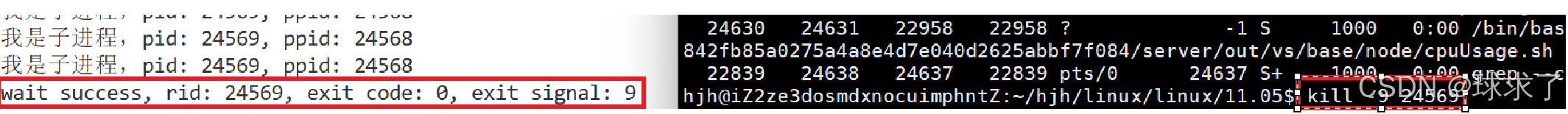 {pid_t id = fork();if (id == 0){//int cnt = 5;while(1){printf("我是子进程,pid: %d, ppid: %d\n", getpid(), getppid());sleep(1);//cnt--;}exit(40);}int status = 0;pid_t rid = waitpid(id, &status, 0);if (rid > 0){printf("wait success, rid: %d, exit code: %d, exit signal: %d\n", rid, (status>>8)&0xFF, status&0x7F); //rid为成功等待的子进程的pid}else{printf("wait failed: %d: %s\n", errno, strerror(errno));}return 0;