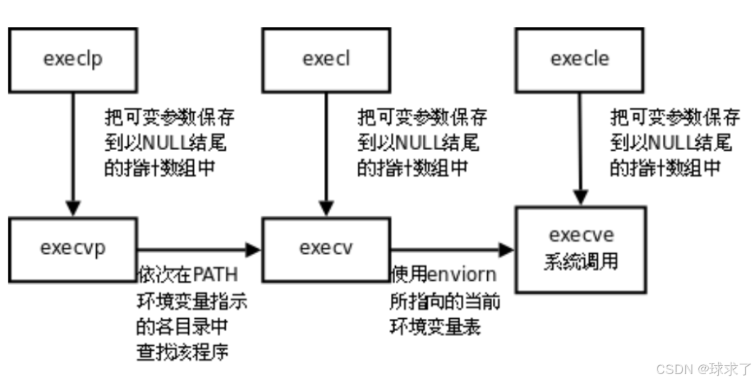 只用execve是真正的系统调用,其他函数内部都封装了execve,这些函数之间的关系如下图所示。