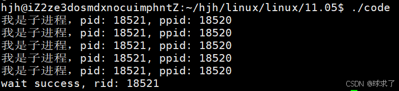 {pid_t id = fork();if (id == 0){int cnt = 5;while (cnt){printf("我是子进程,pid: %d, ppid: %d\n", getpid(), getppid());sleep(1);cnt--;}exit(0);}sleep(10);pid_t rid = wait(NULL);if (rid > 0){printf("wait success, rid: %d\n", rid); // rid为成功等待的子进程的pid}sleep(10);return 0;
