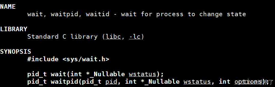 - pid:pid=-1,等待任⼀个子进程。与wait等效。pid>0.等待其进程ID与pid相等的子进程。